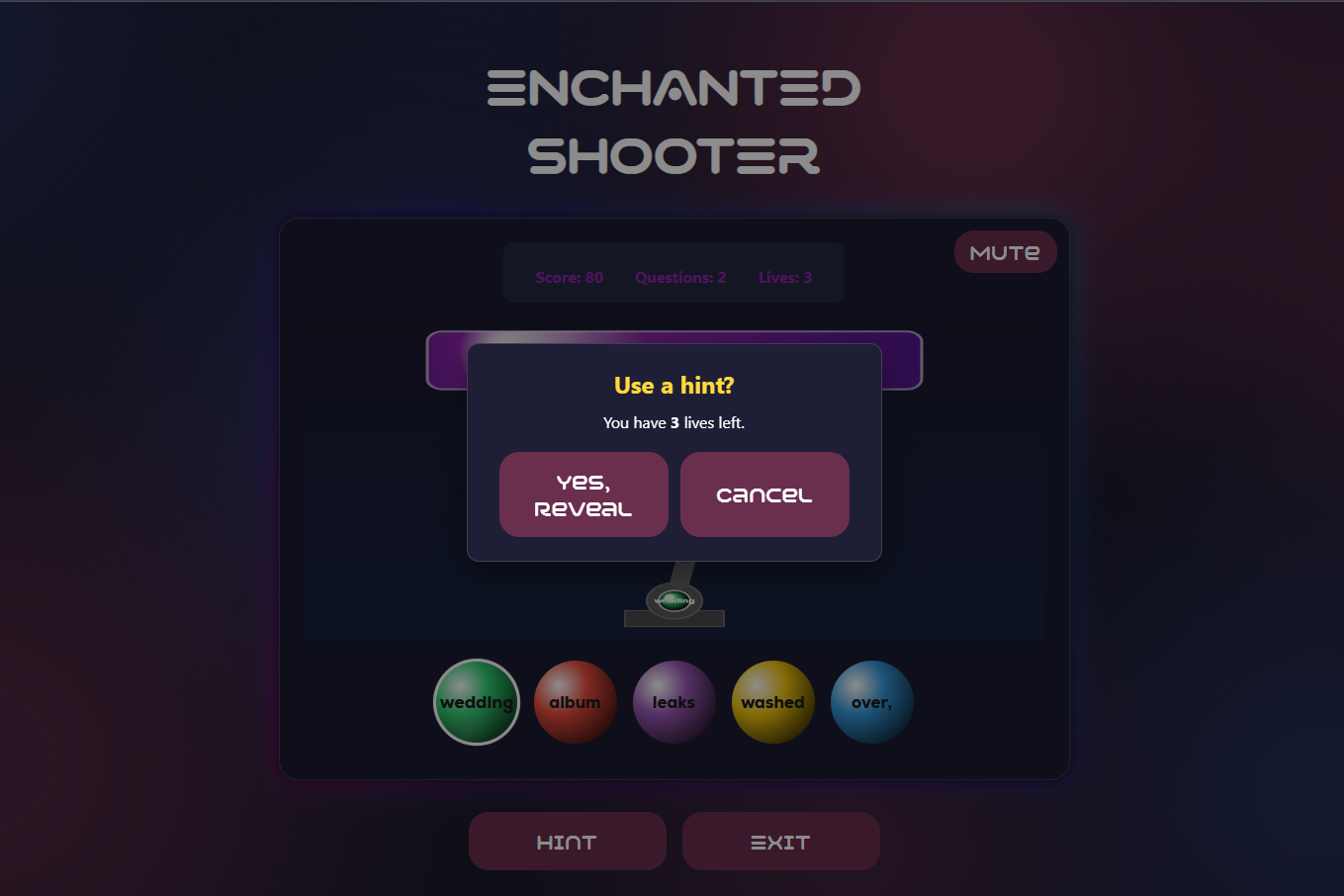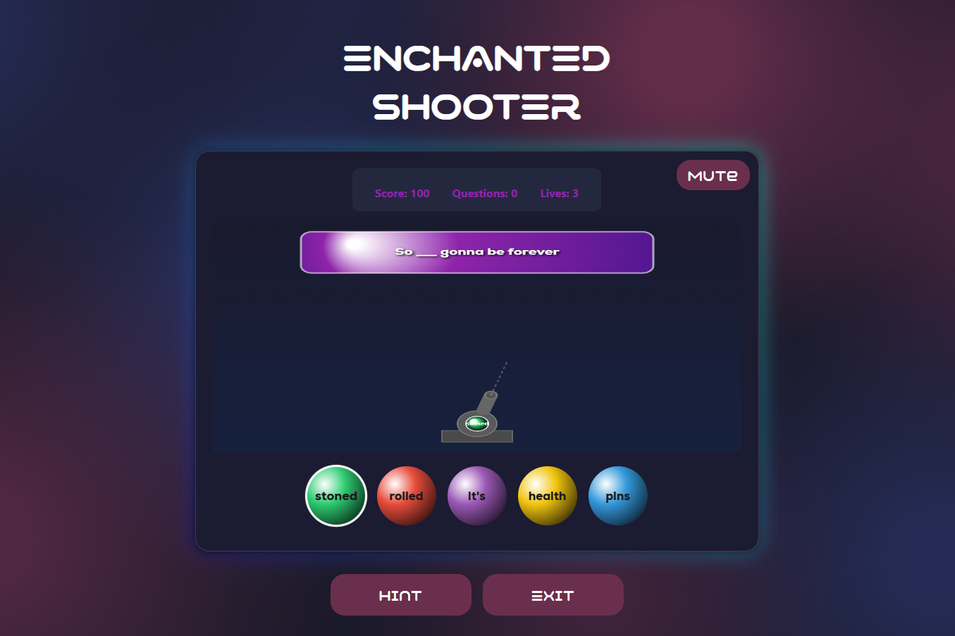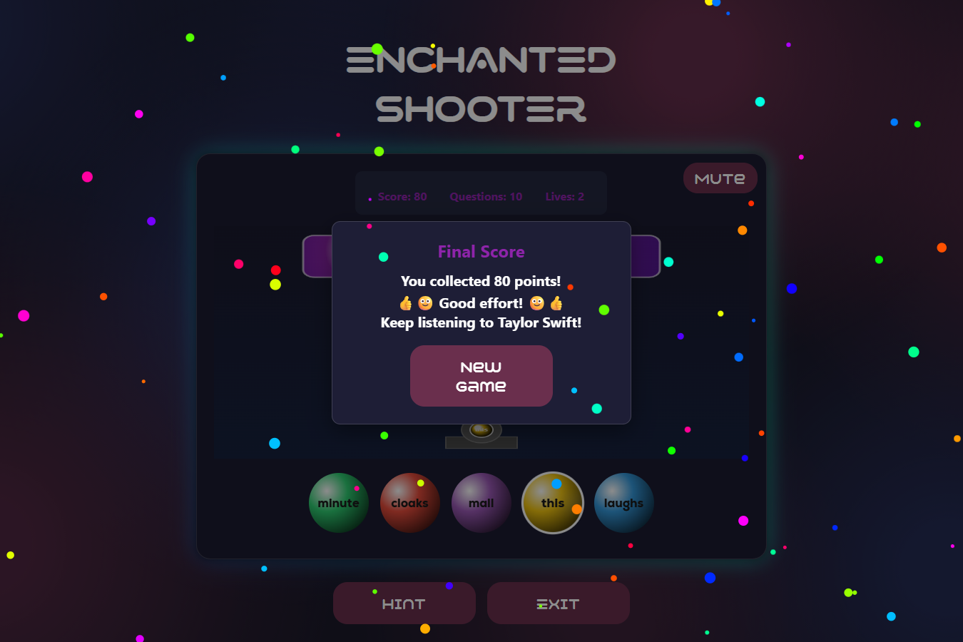 Enchanted Shooter is a bubble shooter–style lyric guessing game that uses an N-gram language model trained on Taylor Swift lyrics. Built with Svelte (frontend) and FastAPI (backend), the game combines interactive design and NLP to create an engaging educational + entertainment experience.